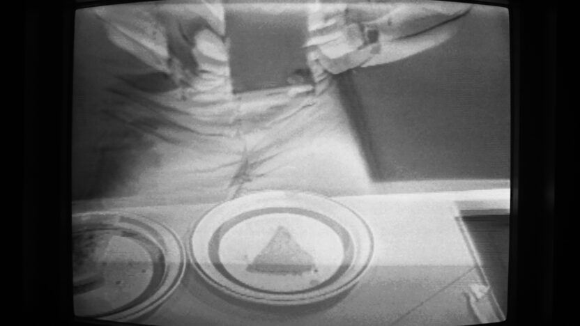In een reeks performances waarin Imai Norio polaroids gebruikt, zien we hem hier punten van een pizza eten terwijl hij deze in beelden doet herleven. Onder het eten vat Imai op speelse wijze de unieke eigenschappen van polaroidfotografie samen in een tafelbladperformance.