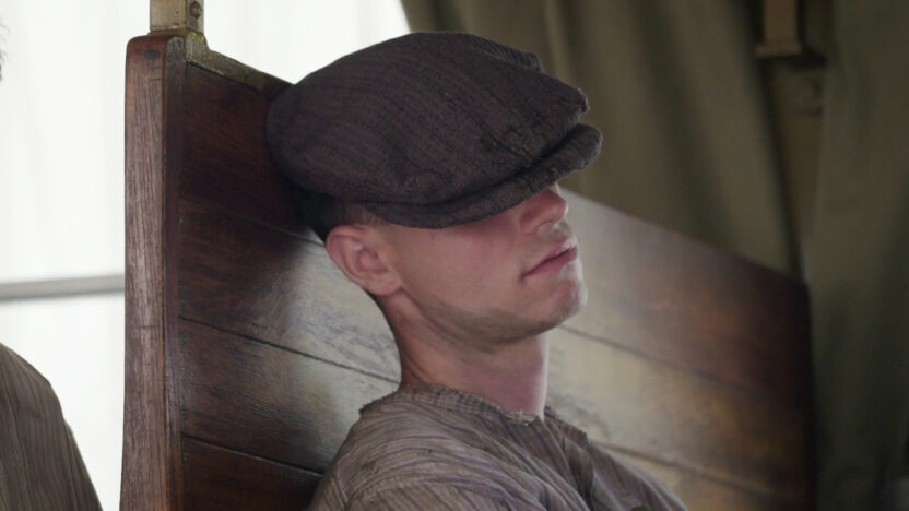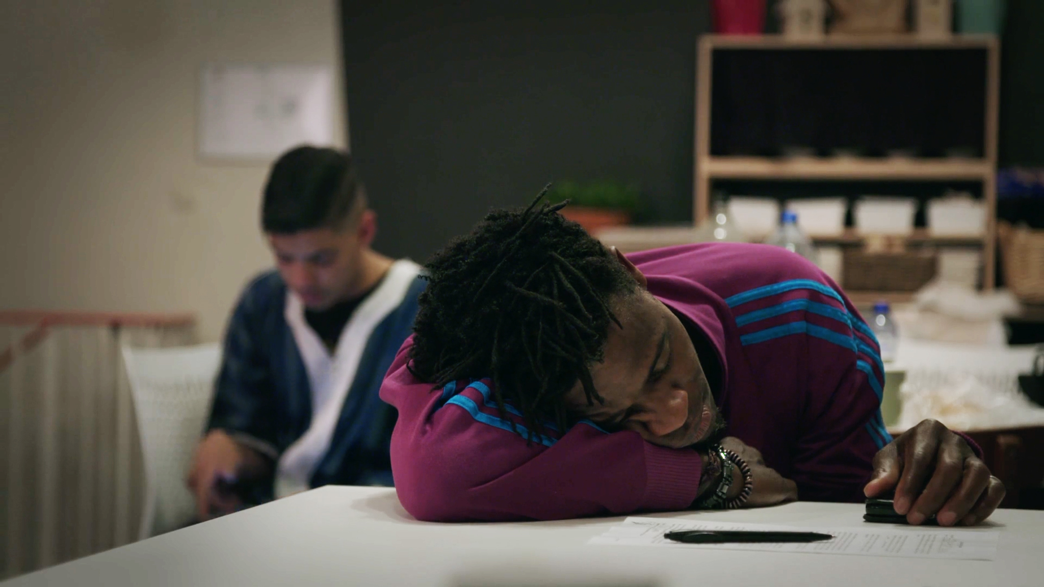 telefoon kijken. We horen regisseurs aanwijzingen roepen en zien