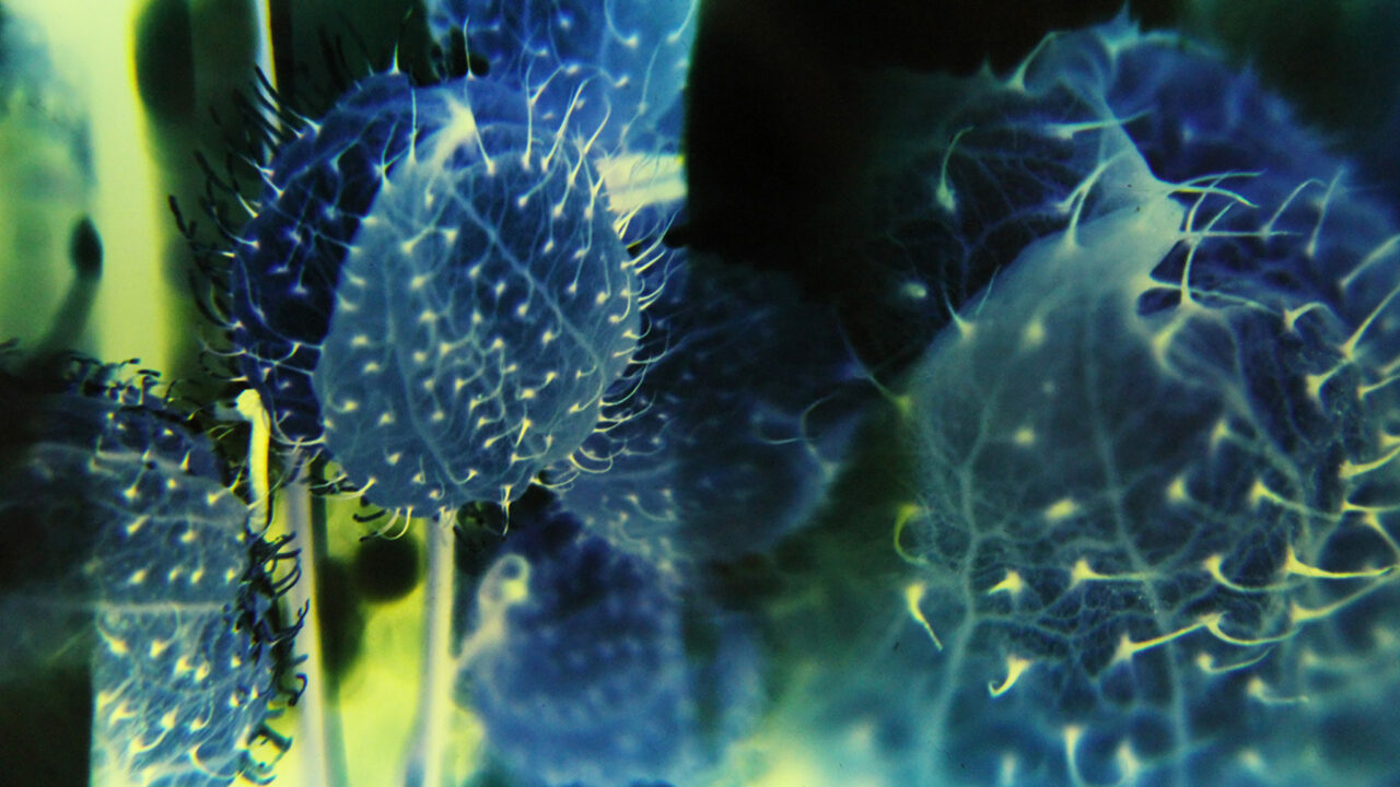 Een ontmoeting met een mysterieuze, lichtgevende substantie en de mythische ‘sterrengelei’, opgevangen in stralende Kirlian-fotografie en handbewerkte