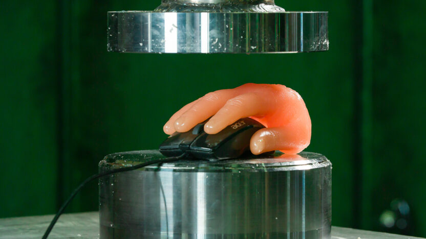 Vleesachtige objecten van gel, gebruikt voor het onderzoeken van kogelinslagen in mensen, worden voortdurend geplet door een hydraulische pers. (AV-ar -