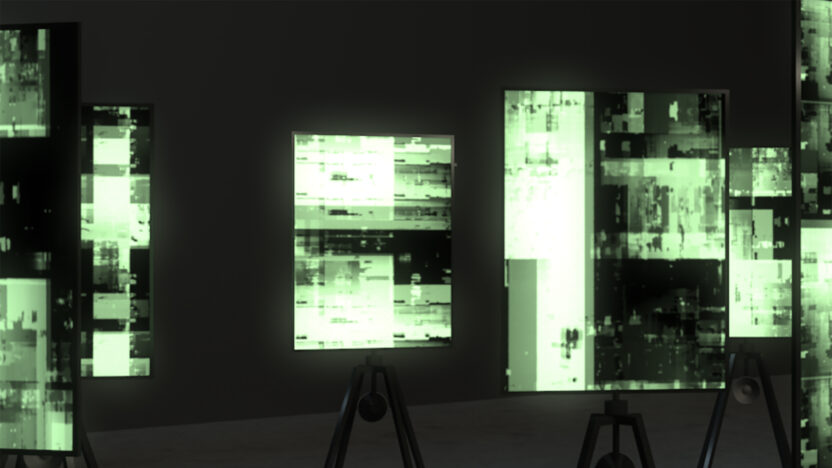 Klankvorm ontwikkelde SVNSCRNS, een kinetische licht- en geluidsinstallatie met zeven roterende beeldschermen en speakers. Voor deze expositie in V2_ maakte Macular een compositie gebaseerd op lijnstructuren en geluidsvisualisatie. Het Macular-collectief heeft een gedeelde interesse in kunst, wetenschap, technologie en perceptie.