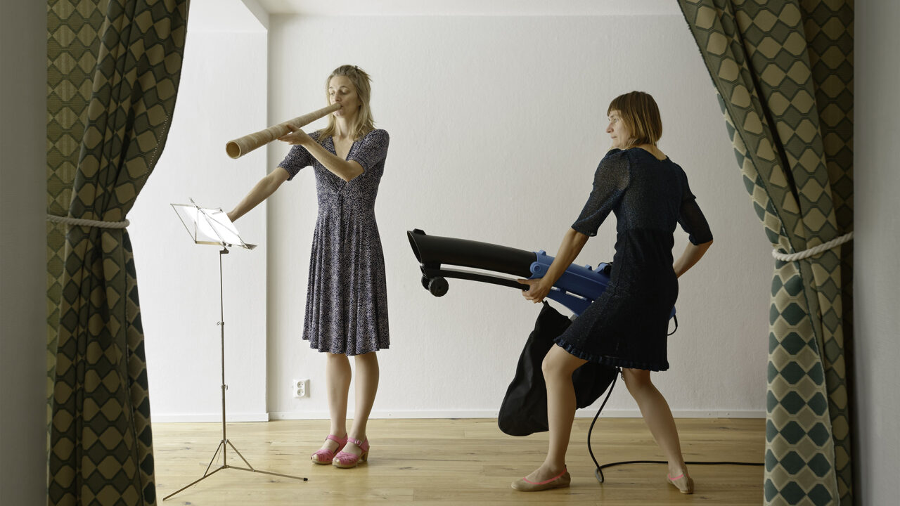 Naar Mieko Shiomi, Wind Music, Fluxversion I, 1963: Bladmuziek wordt van de standaard geblazen door een sterke blazer in de coulissen, terwijl het orkest de bladen tegen probeert te houden. (AV-arkki)