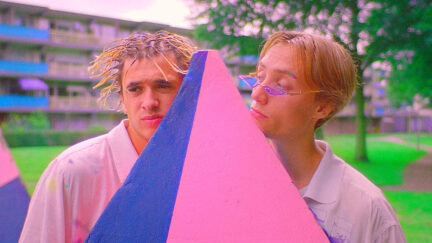 Dat regisseur Sam de Jong visueel knetterende films maakt, werd al duidelijk met zijn debuutfilm Prins (2015) en het in Amerika gefilmde Goldie (2019). In Met mes staat álles in overdrive: van de muziek tot de uitgesproken camerastandpunten en -bewegingen, van de synthetische trainingspakken en groene eyeliner tot de spelshow-geluidseffecten die de emoties moeten benadrukken. Het kleurenfilter creëert een wereld van zuurstoktinten, een neonkleurige jarentachtig-videofantasie waarin Hadewych Minis een plaatjesbeugel heeft en Gijs Naber een rattenstaartje.