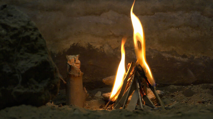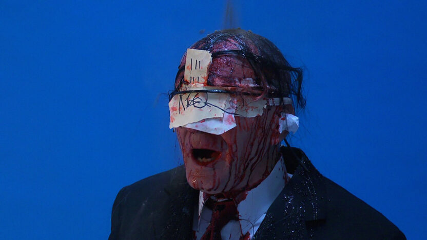 Omineus bewegende voorwerpen creëren spanning terwijl er een ‘vrolijk’ lied klinkt. In Stanya Kahn’s morbide, humoristische samenwerking met schilder Llyn Foulkes, wier unieke driedimensionale benadering een inspiratiebron vormt, zien we de kunstenaar geblinddoekt, bedekt onder bloed en stof, en horen we een nummer, geschreven en uitgevoerd door Foulkes.
