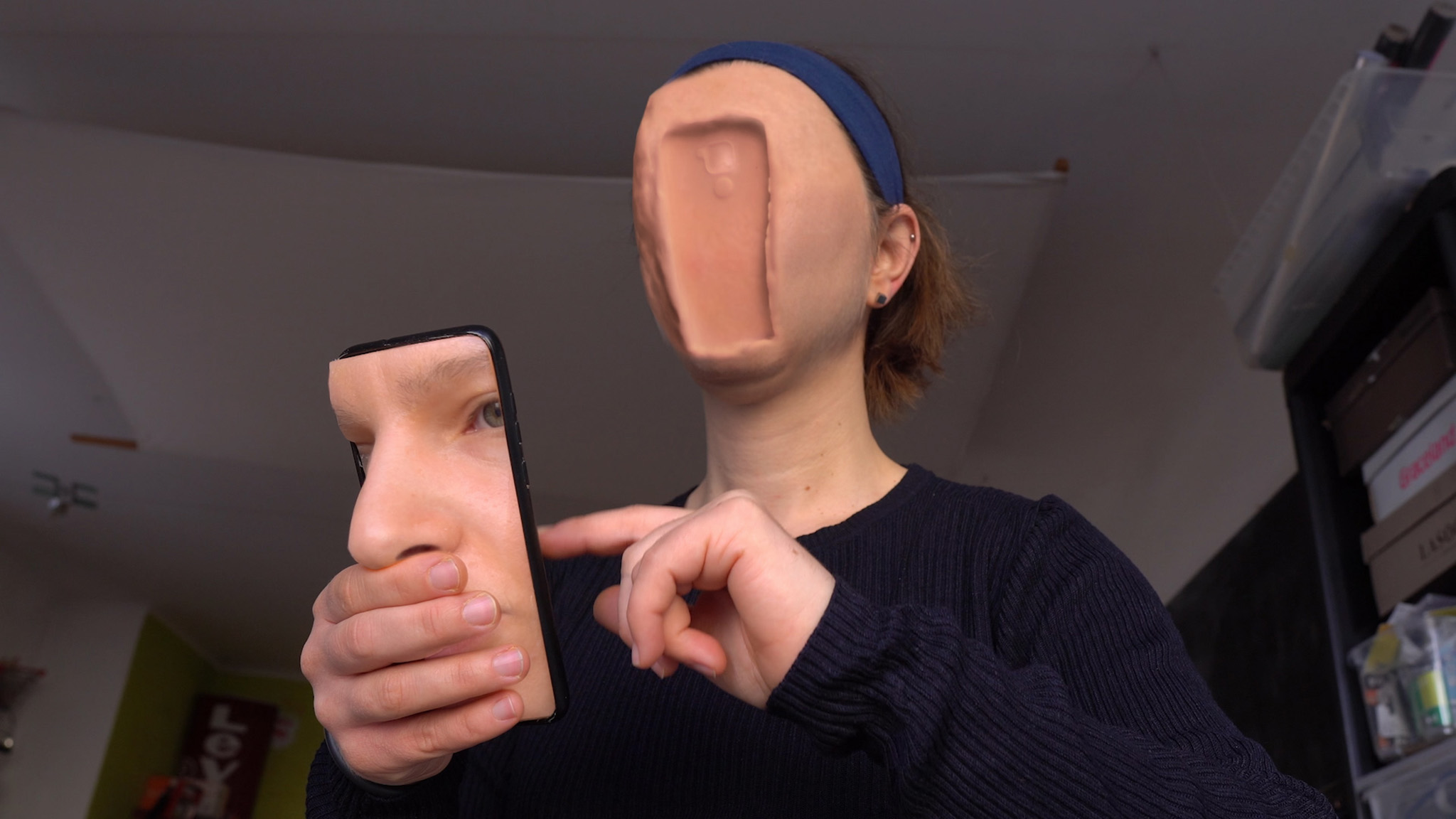 Hoeveel manieren bestaan er om het menselijk lichaam in tweeën te delen? Boven en onder, links en rechts, omhoog en omlaag… Voor elk lichaamsdeel verzint kunstenaar Anna Vasof een verrassende, geestige manier van splitsen en omkeren, uitgevoerd met naadloze digitale effecten. Vervolgens breidt ze het spel uit naar de relatie tussen het lichaam en mobieltjes, mondkapjes – alles waar we mee omgaan. Zoals in al haar werk weet Vasof het gewone uiterst ongewoon te maken.