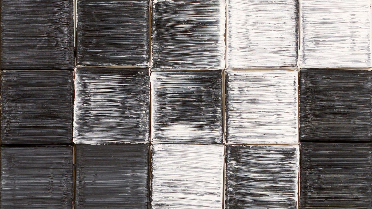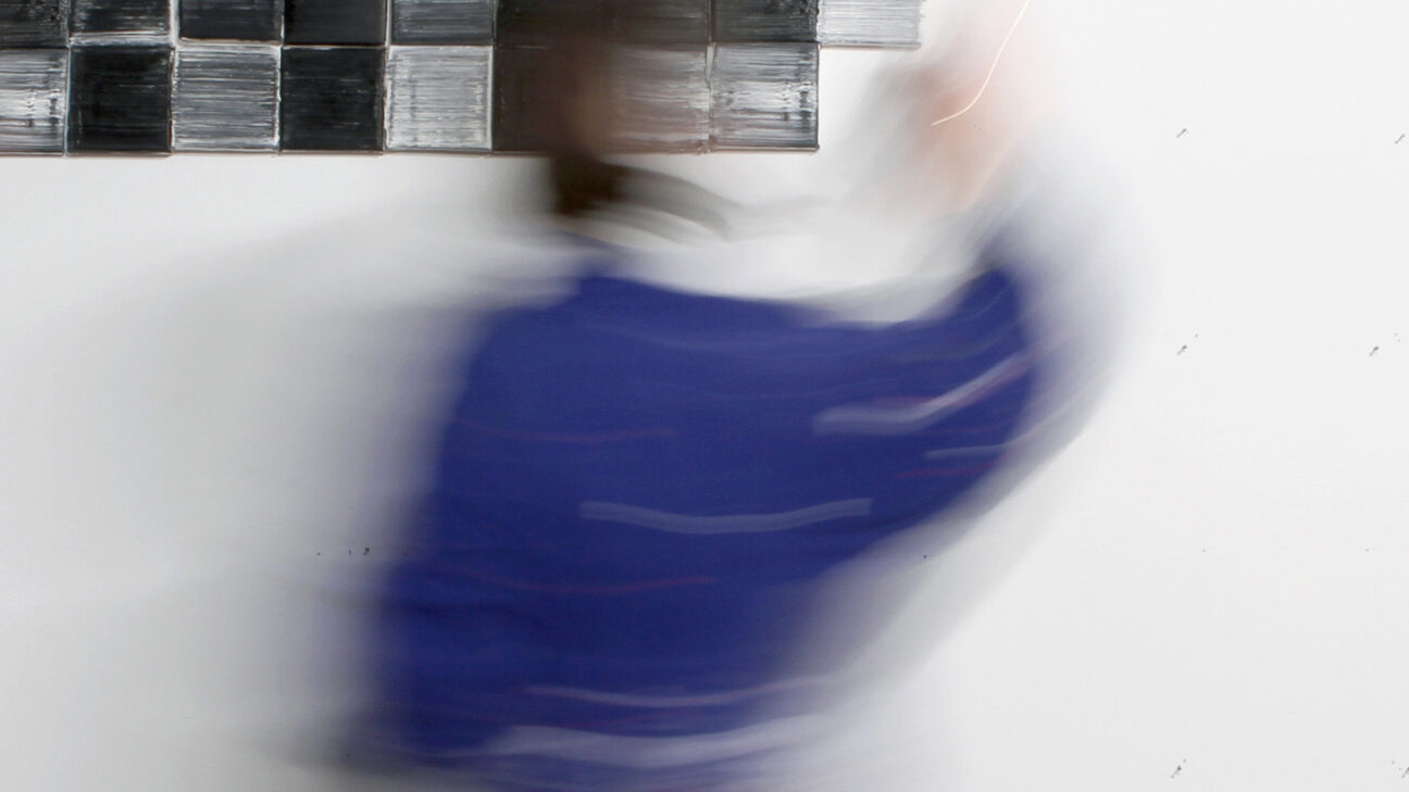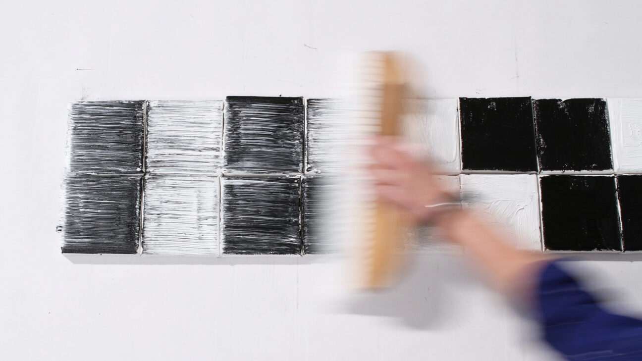 Zwarte, witte en grijze vlakken wisselen elkaar in rap tempo af. Wat in eerste instantie op een willekeurige verzameling van blokjes lijkt, blijkt pixel voor pixel een geheel te vormen. Langzaam komen herkenbare situaties scherper in beeld.