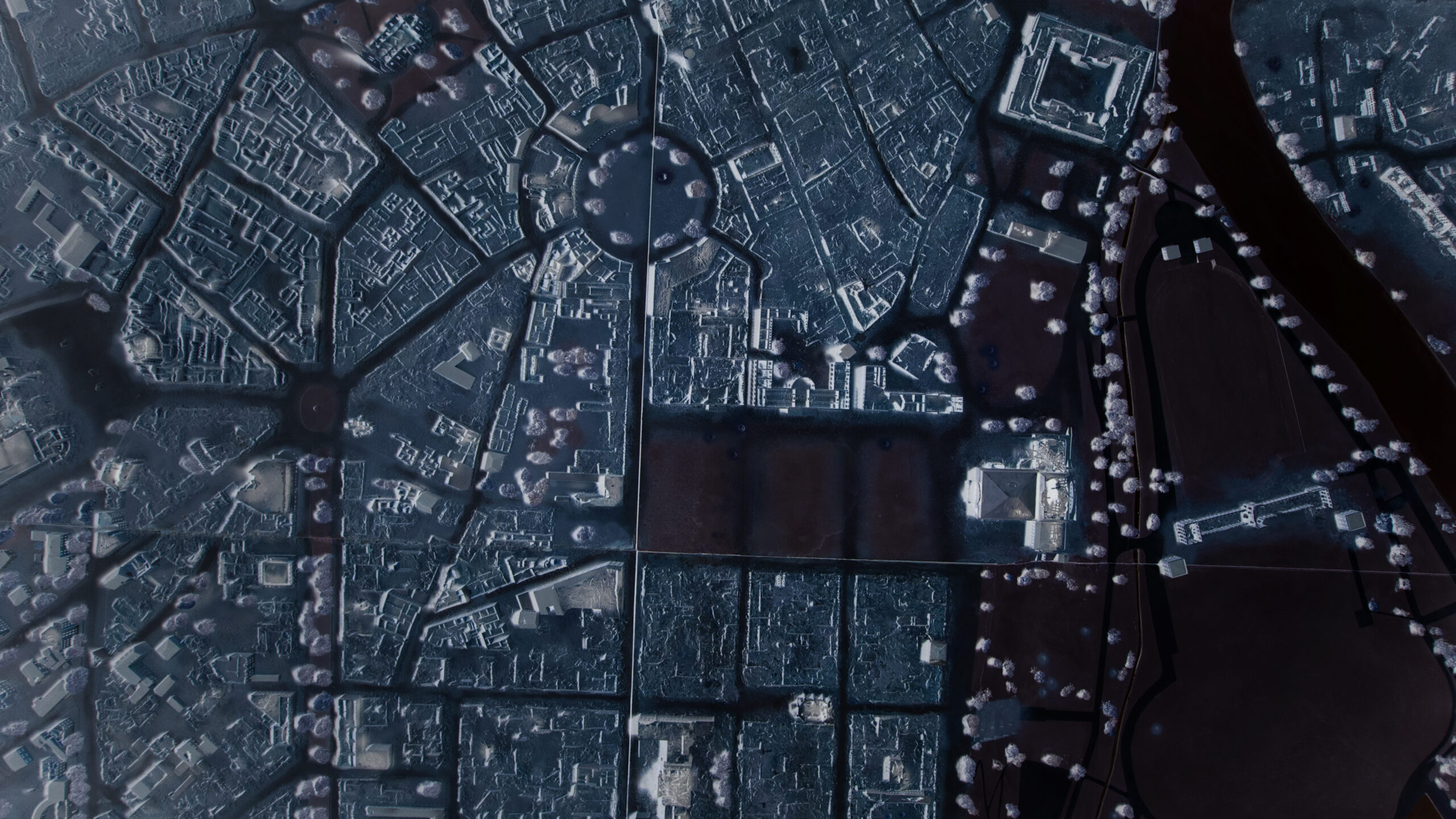 Een maquette van een verwoest stadscentrum. M leert alles over een stad in een onveilige zone waar hij niet vandaan komt. -