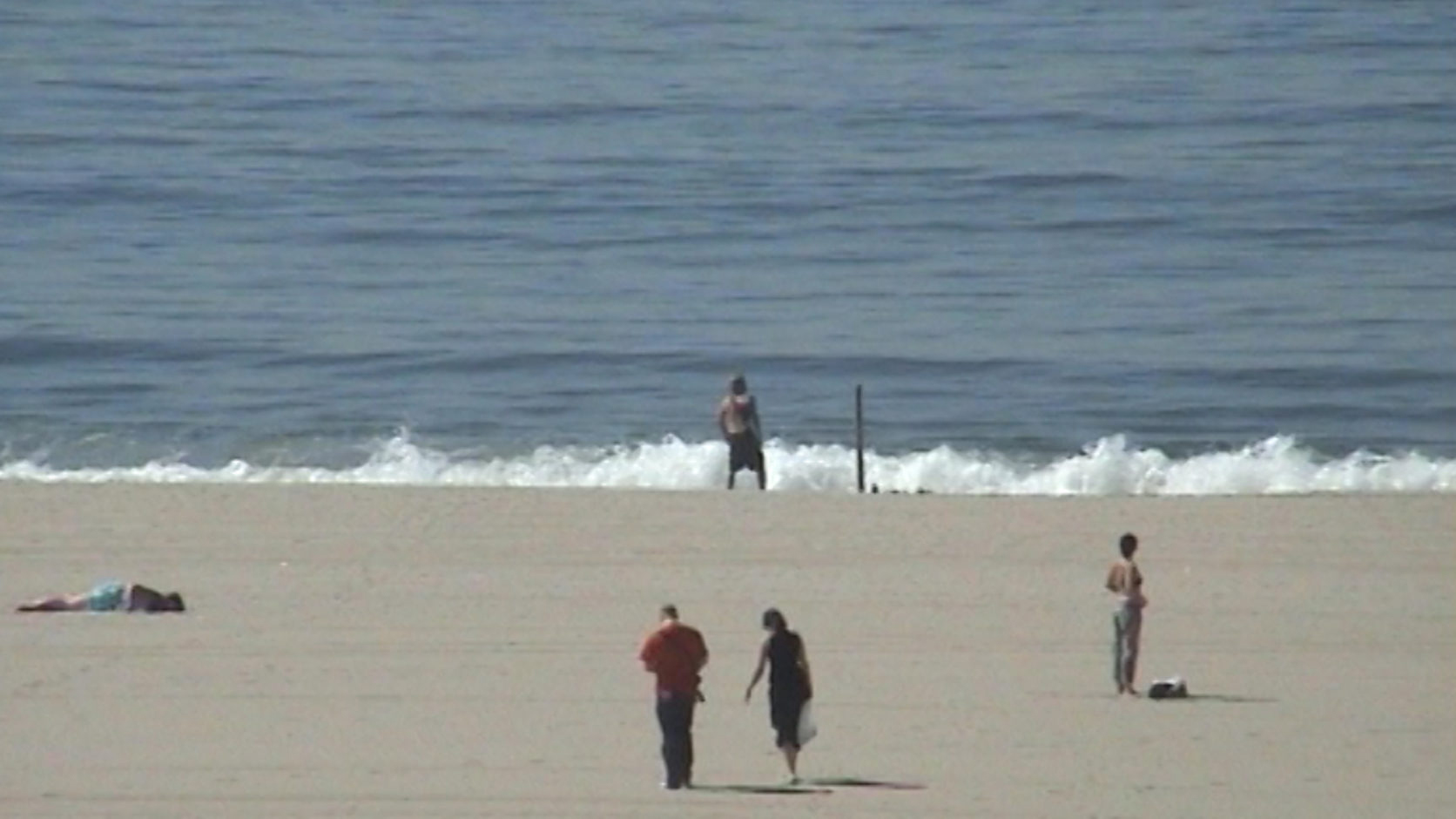 Een man danst in zijn eentje op muziek op zijn koptelefoon op een strand in Santa Monica, terwijl een stel terloops praat over grof racisme. (LUX -