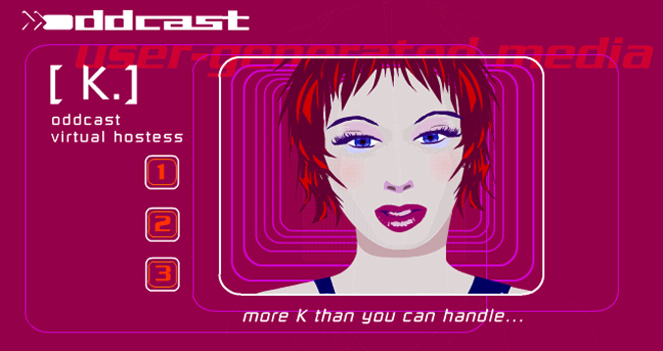 K is Oddcasts eigen cyberberoemdheid, een ‘web-j’ die is ontwikkeld met hun eigen ‘virtual host’ technologie. De charmante gastvrouw is de persoonlijke gids langs verschillende… -