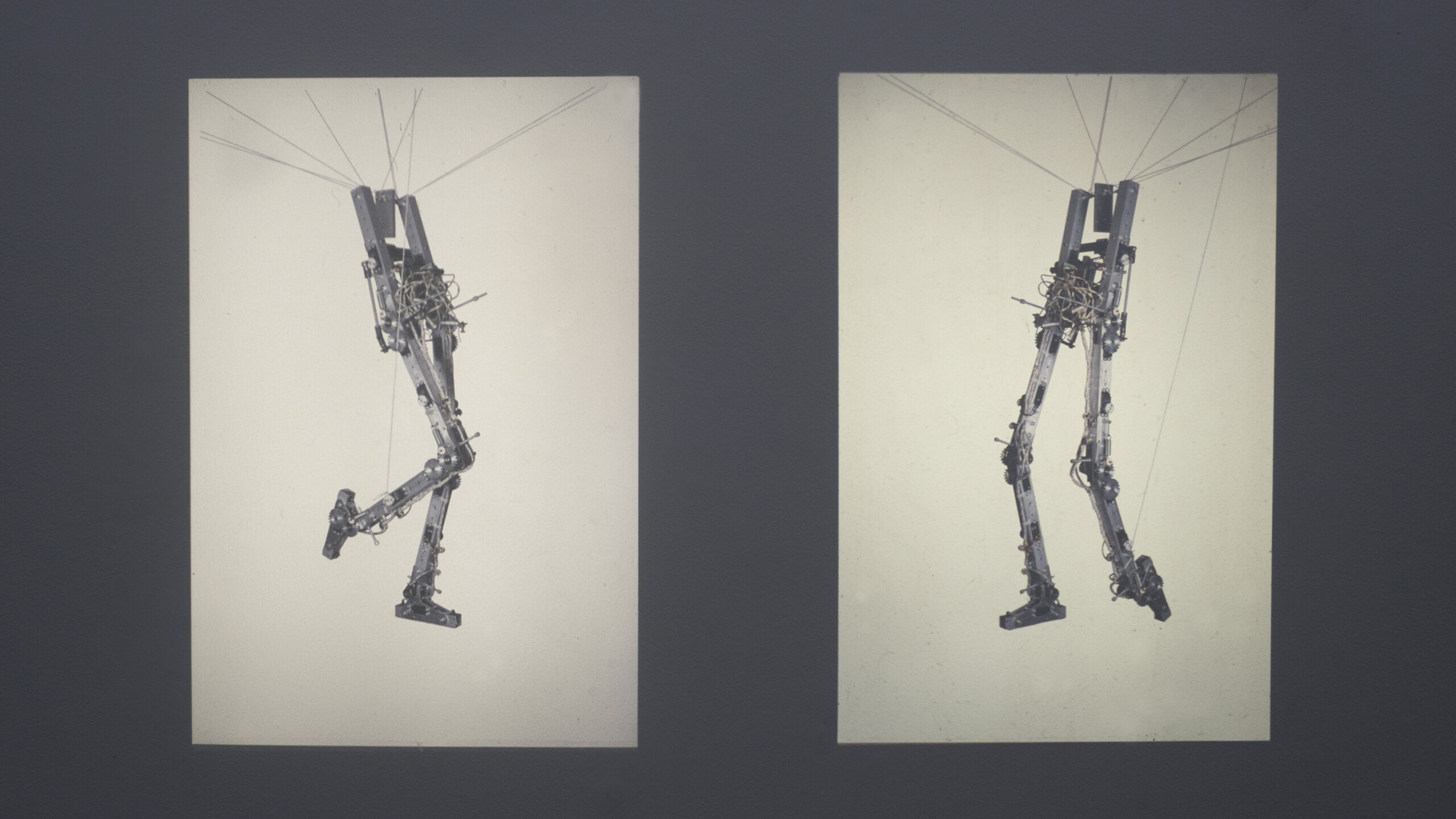 Twee projectoren laten robotbenen bewegen. Het geluid van de projectoren, voortgestuwd door de enen en nullen van een Arduino, biedt een mechanisch ri -