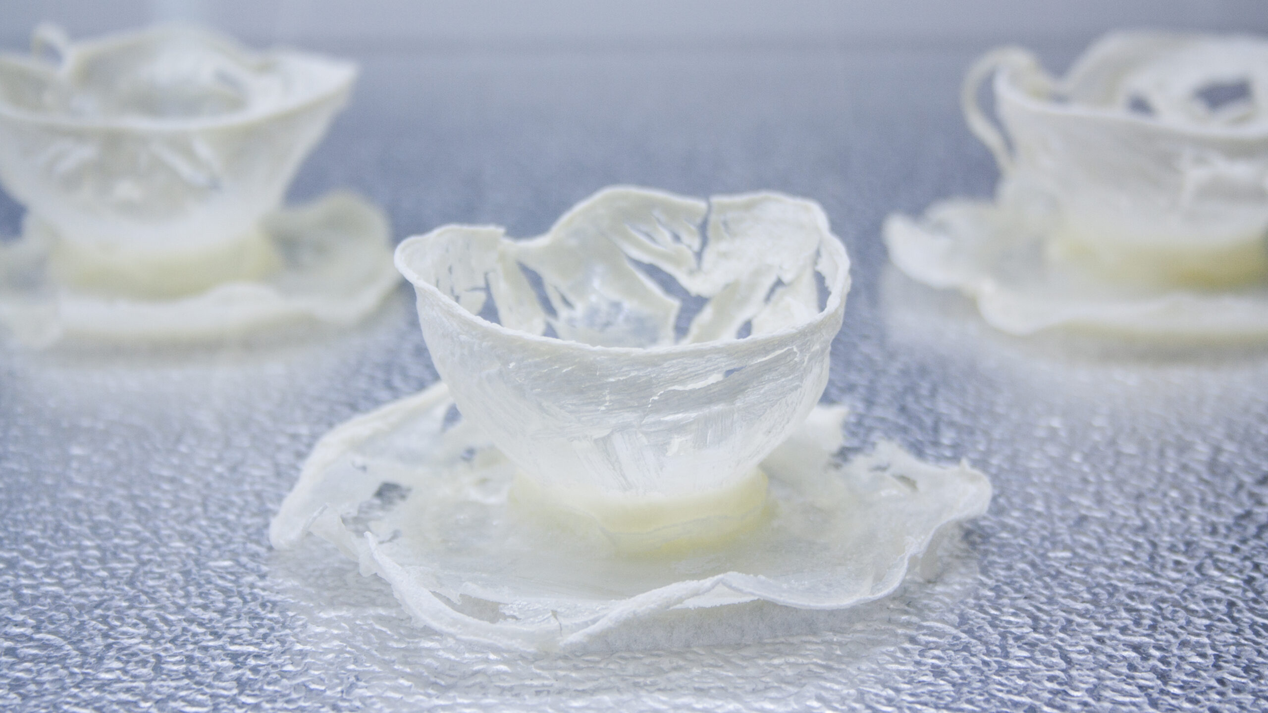 Bevroren melk in de vorm van een theeservies wordt getoond in een vitrine die doet denken aan Sneeuwwitjes glazen doodkist. Geen eeuwig leven zonder e -