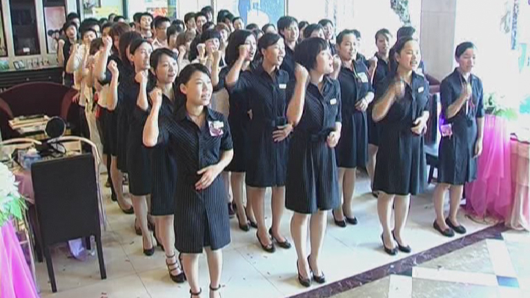 In deze speelse collage die de militarisering van de werkplek bekritiseert, zien we Chinese werknemers hun personeelsnummer schreeuwen in groepsbijeen -