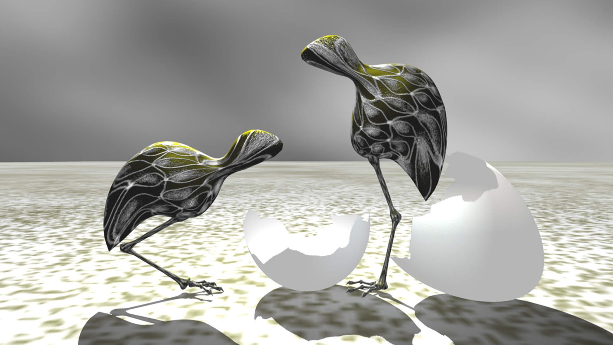 Gestileerde 3D-computeranimatie, waarin een goudkleurige vogel met één poot door een groot, grauw gebouw hupt. Op zijn tocht door kamers en over trappen komt hij… -