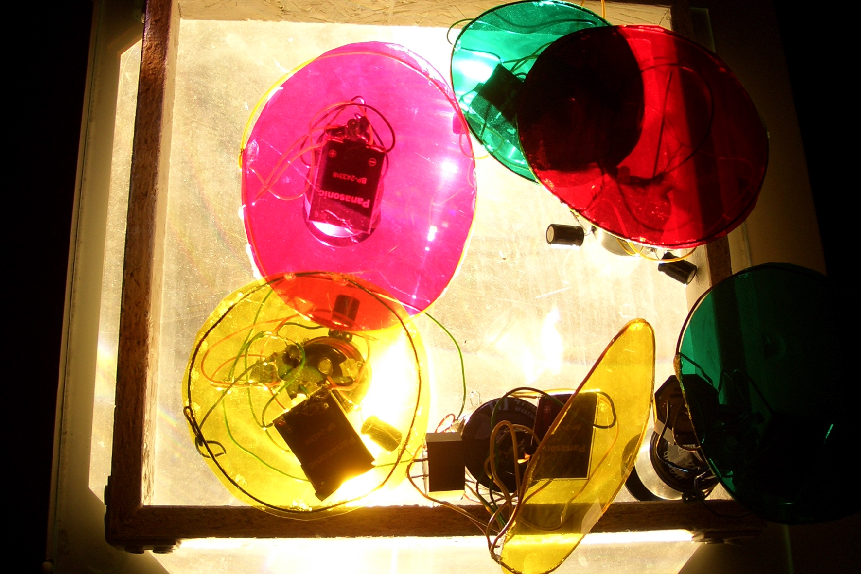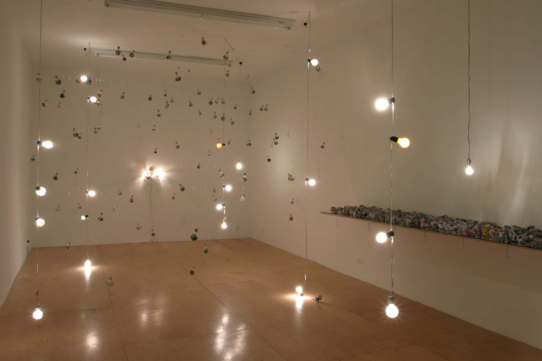 Honderden gloeilampen, sommige knipperend, andere onaangesloten, maar allemaal beplakt met afbeeldingen uit allerlei plastic geknipt, vormen samen een -
