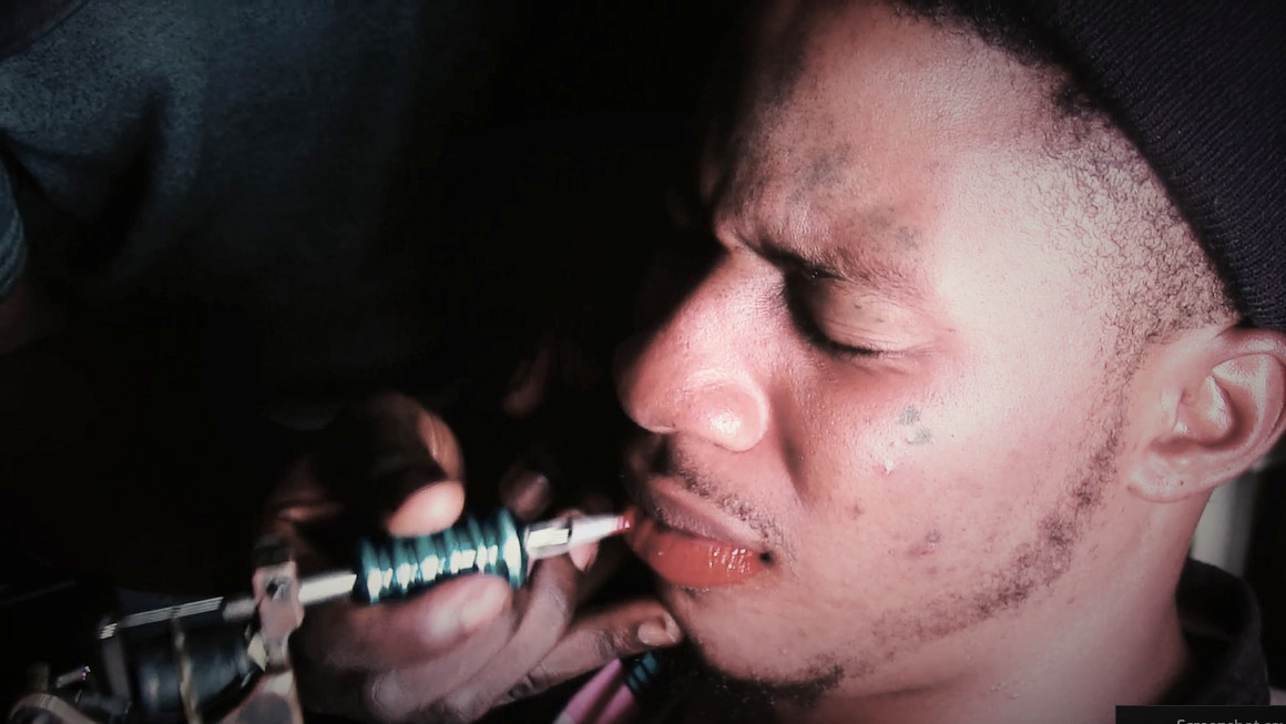 Op een drukke markt in Lagos Mainland maakt John mannen mooi door hun lippen roze te tatoeëren.