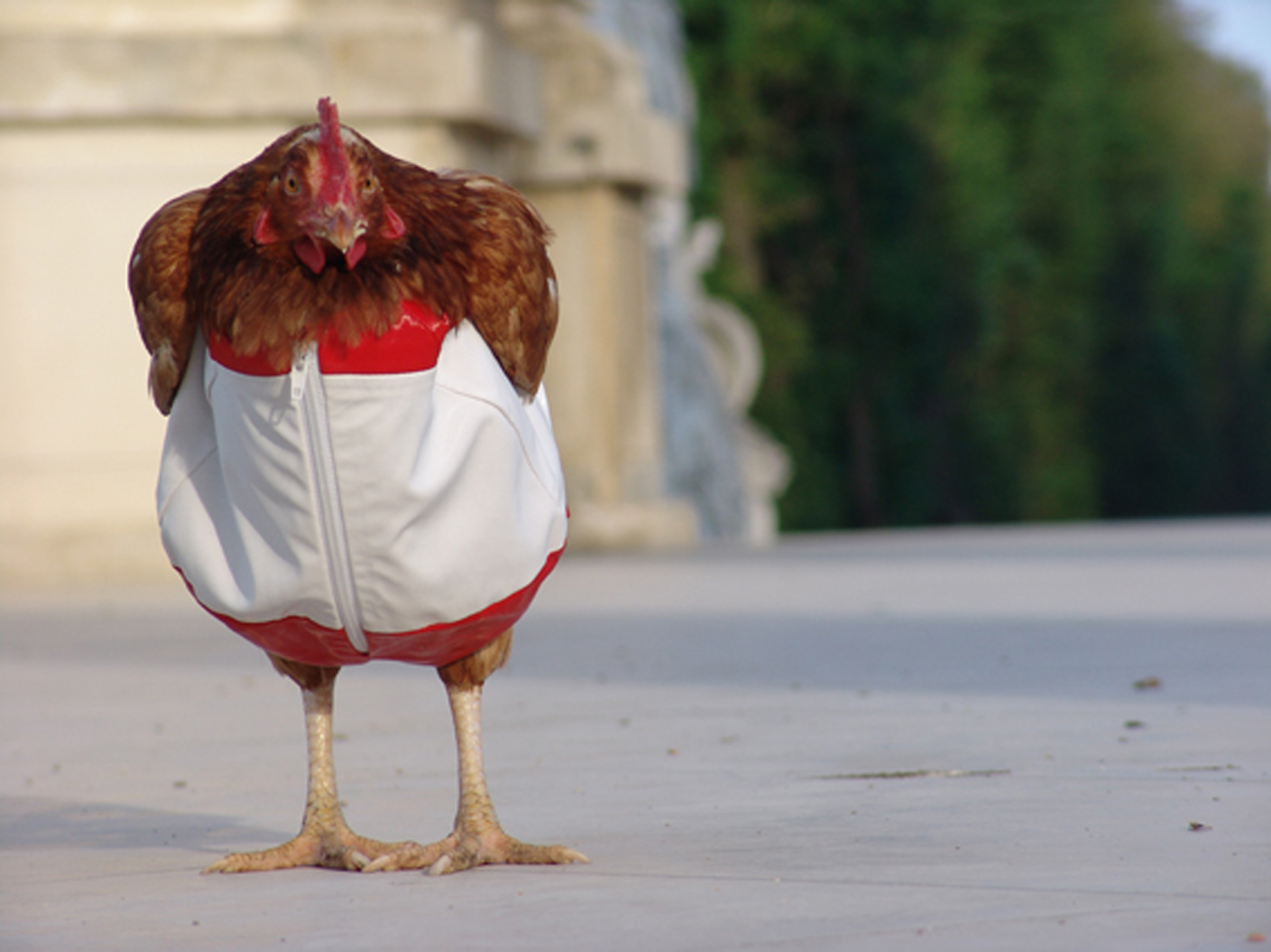 Een kip in een kostuum wordt achtervolgd door de straten van Wenen. Een statement. -