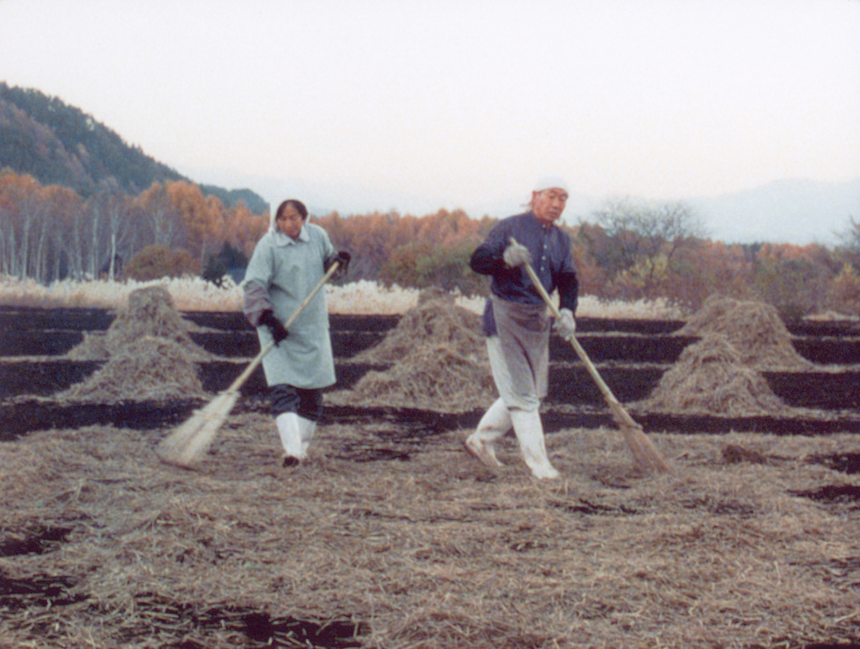 Een Japans boerenpaar bundelt hooi en spreidt die later weer uit over het veld. Een visuele studie van beweging, compositie en handeling. -