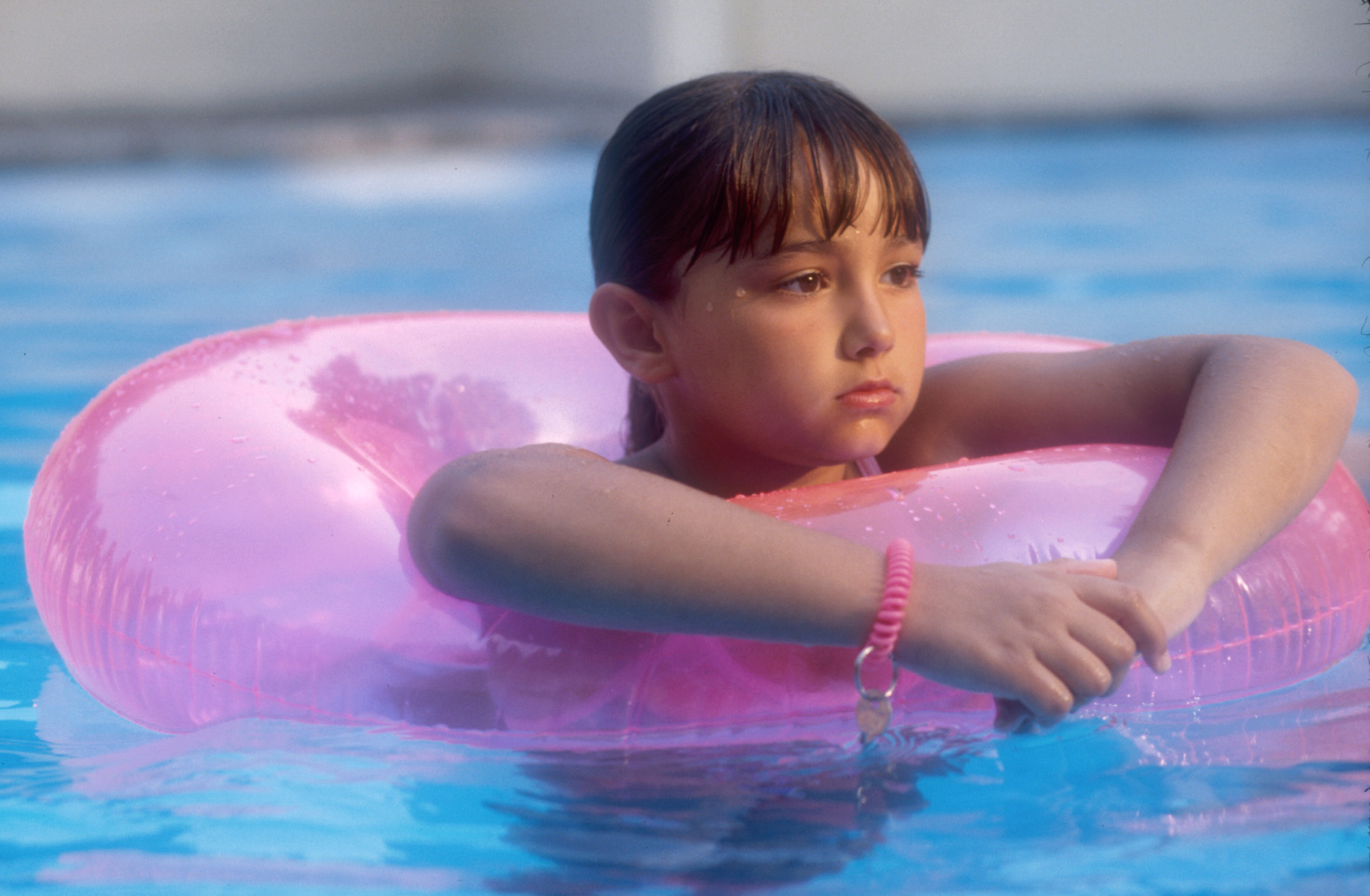 Een verveeld achtjarig meisje aanschouwt tijdens een hete zomerdag aan de rand van het zwembad een mysterieuze nieuwkomer. -