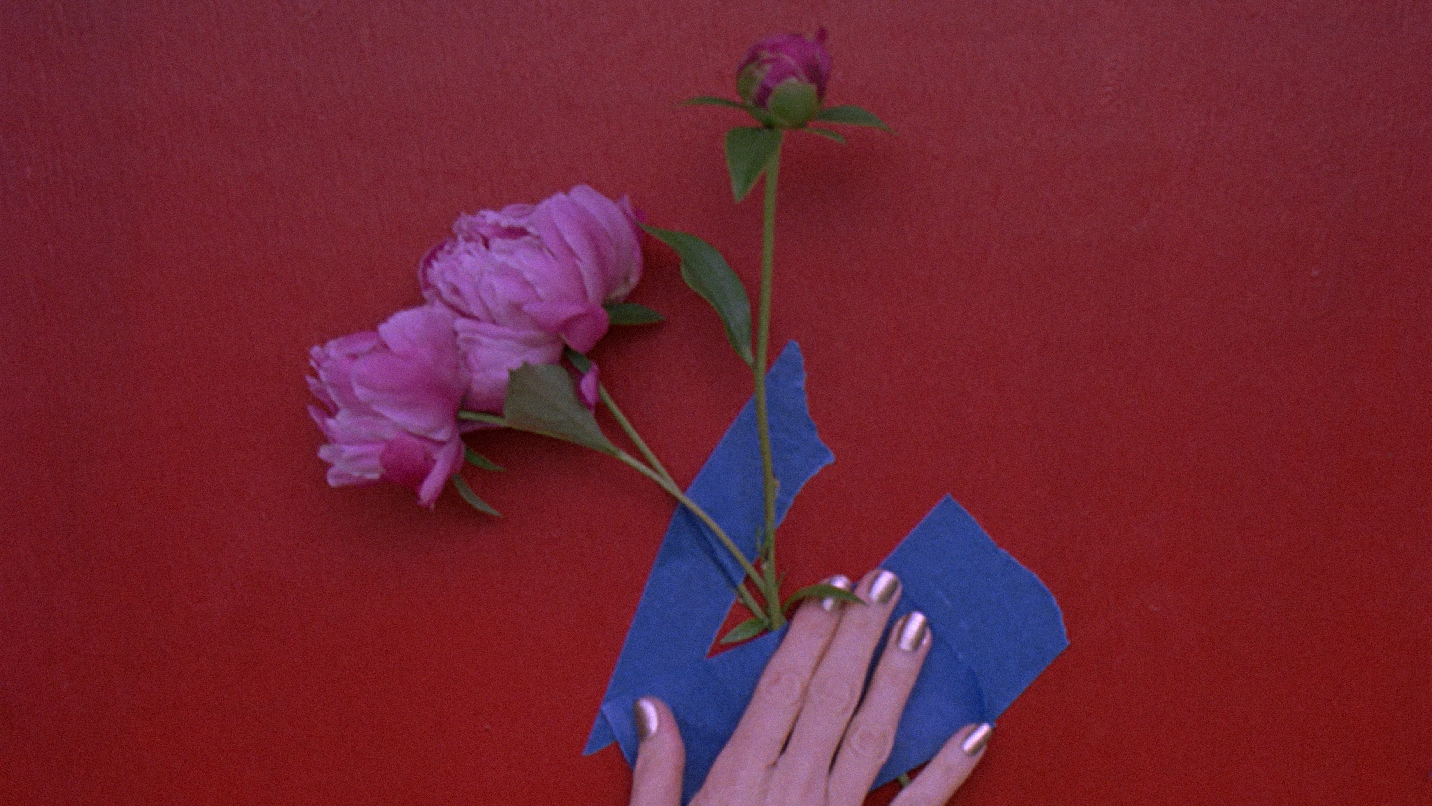 Bloemen worden vastgeplakt en bedekt onder plakband: ironisch commentaar op 20e-eeuwse modernistische kunst. -