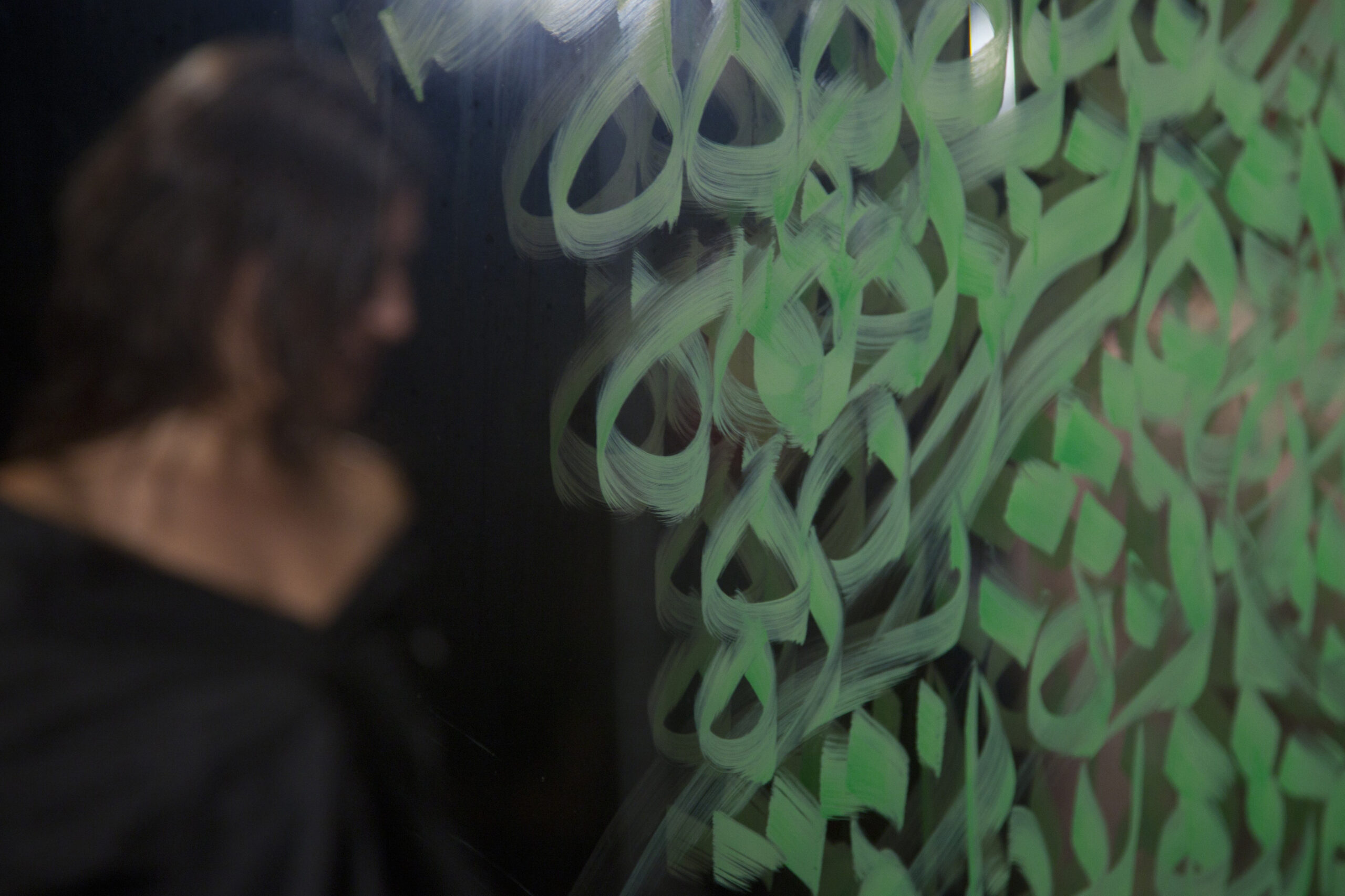 Een kunstenaar schildert een gedicht op een glazen doek. Zijn model raakt uit het zicht door het fraaie schrift van de oude versregels. Het glas… -