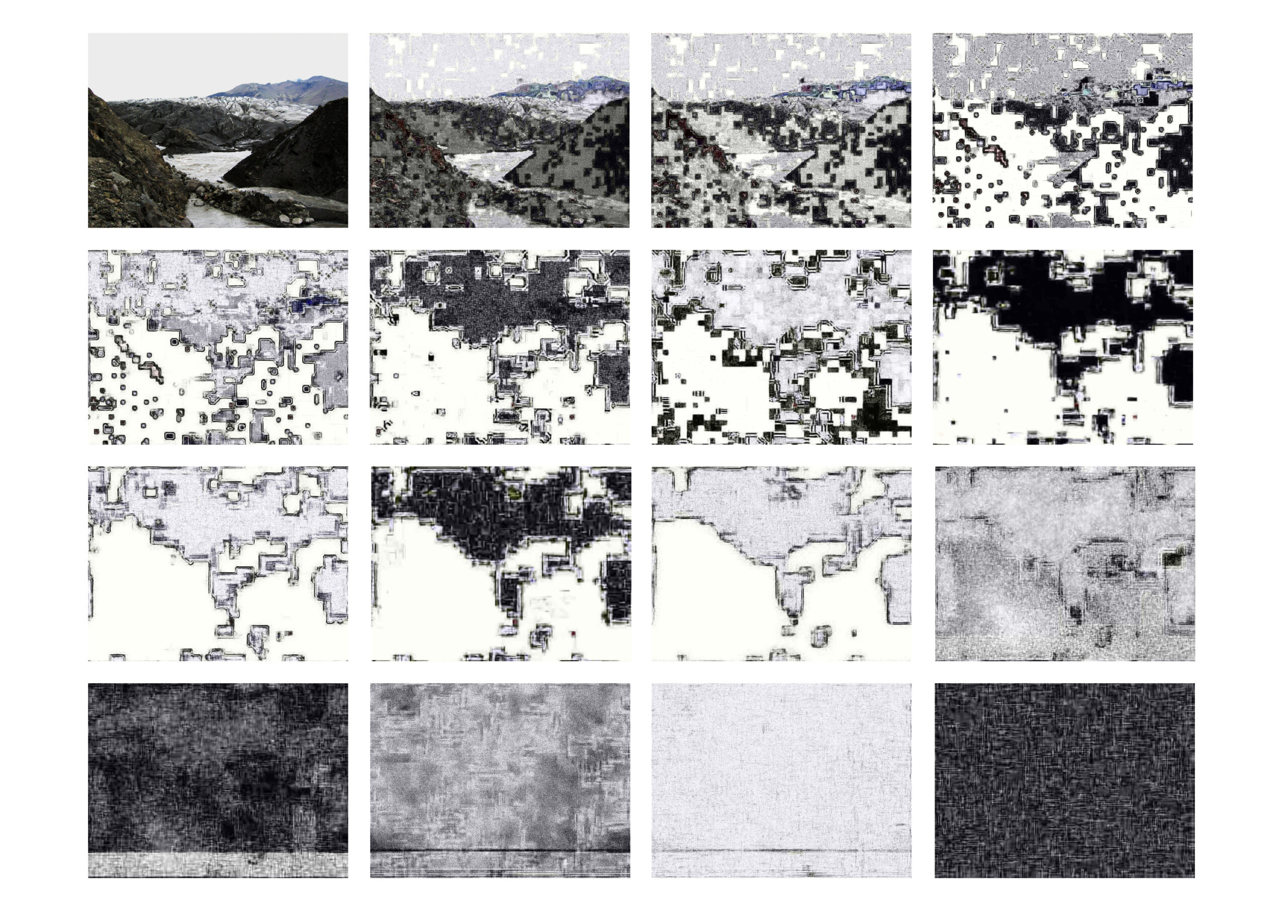Een foto van een gletsjer wordt via een reeks transformaties geleidelijk uit elkaar gehaald – ‘gesmolten’ – totdat het een volledig abstracte composit -
