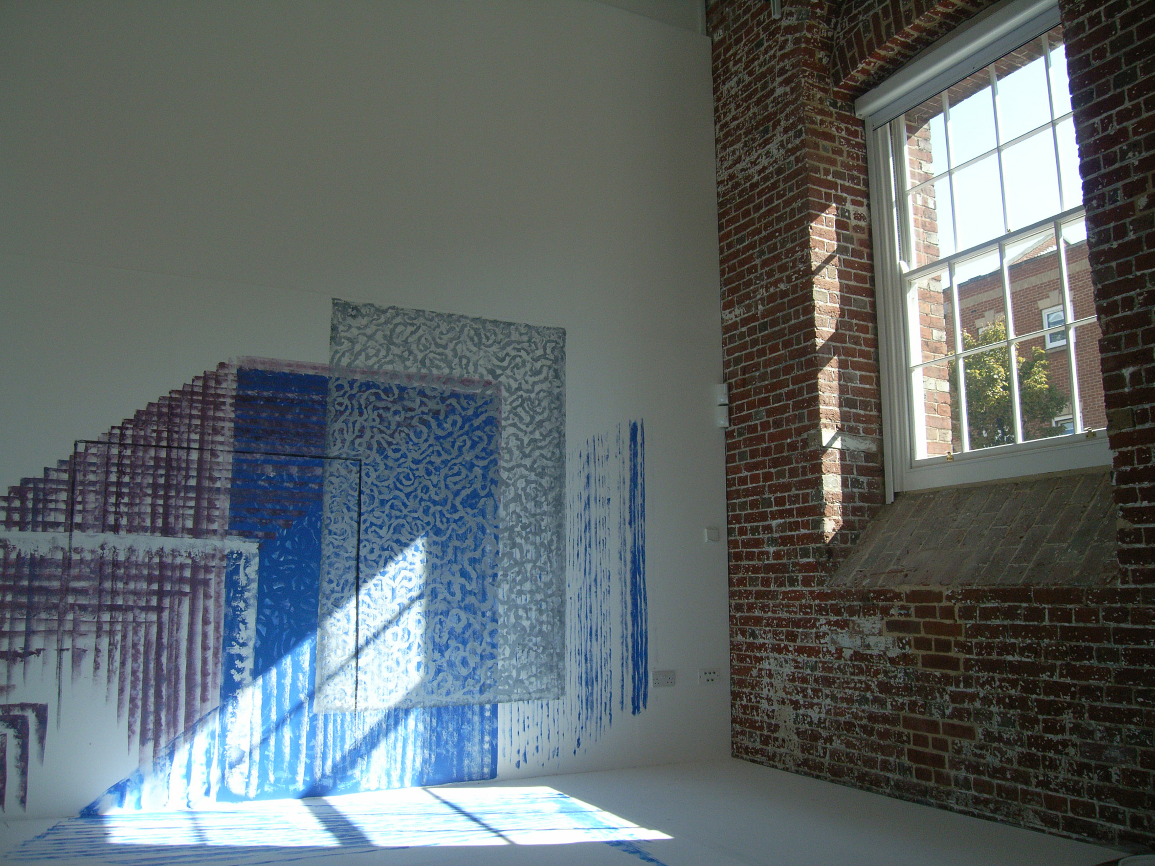 Bewegend zonlicht op de witte muur van een galerie wordt gefixeerd in verf. Langzaam ontstaat een complexe en kleurrijke wandschildering. -