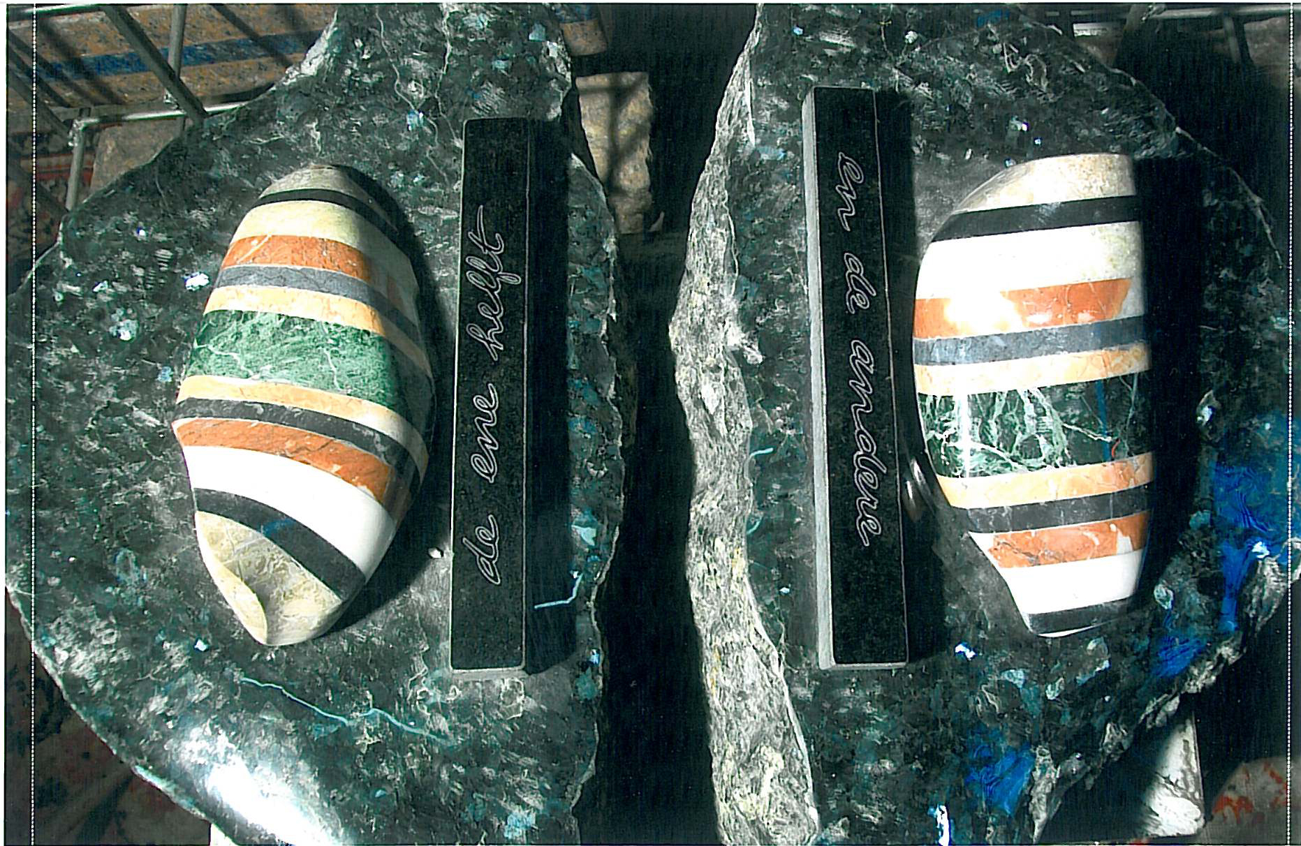 Assemblage van de terugkerende elementen uit het leven van kunstenaar/muzikant Luyken: zijn stenen, zijn rituelen, zijn kano, het leven en de dood. -