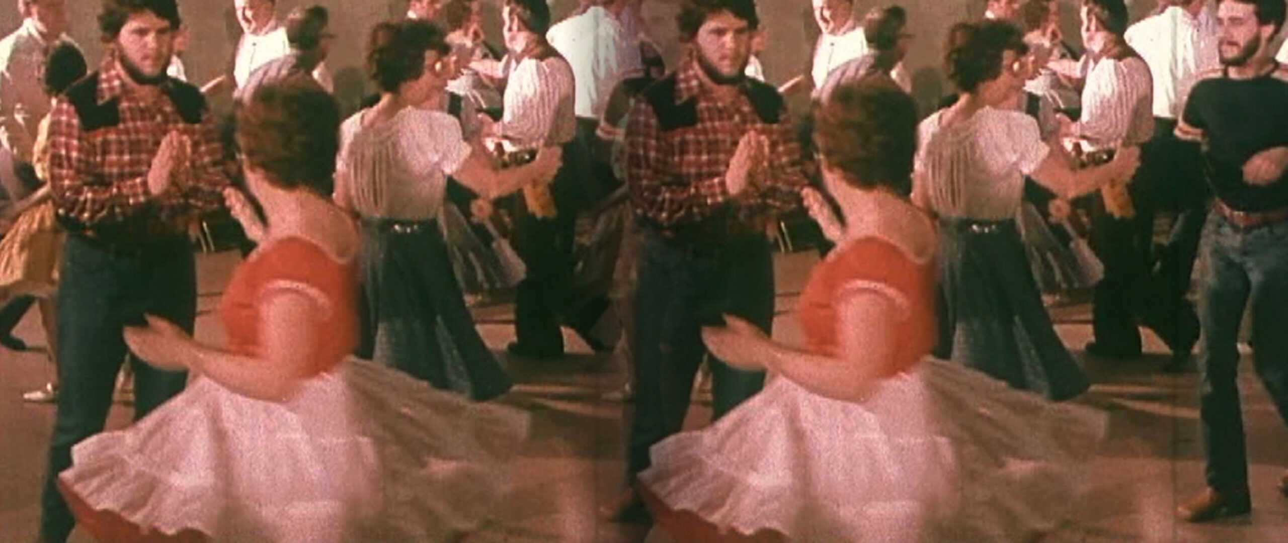 Desoriënterende herhaling van een stukje squaredance visualiseert ontheemding en vluchtzucht, en draait het publiek dol. -