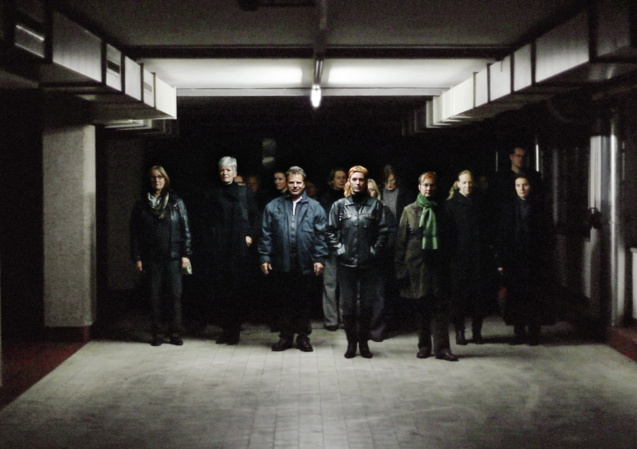 Knipperende neons transformeren een fabrieksgang tot een indrukwekkend licht- en klanksculptuur. De arbeiders bewegen zich er zwijgend doorheen richti -